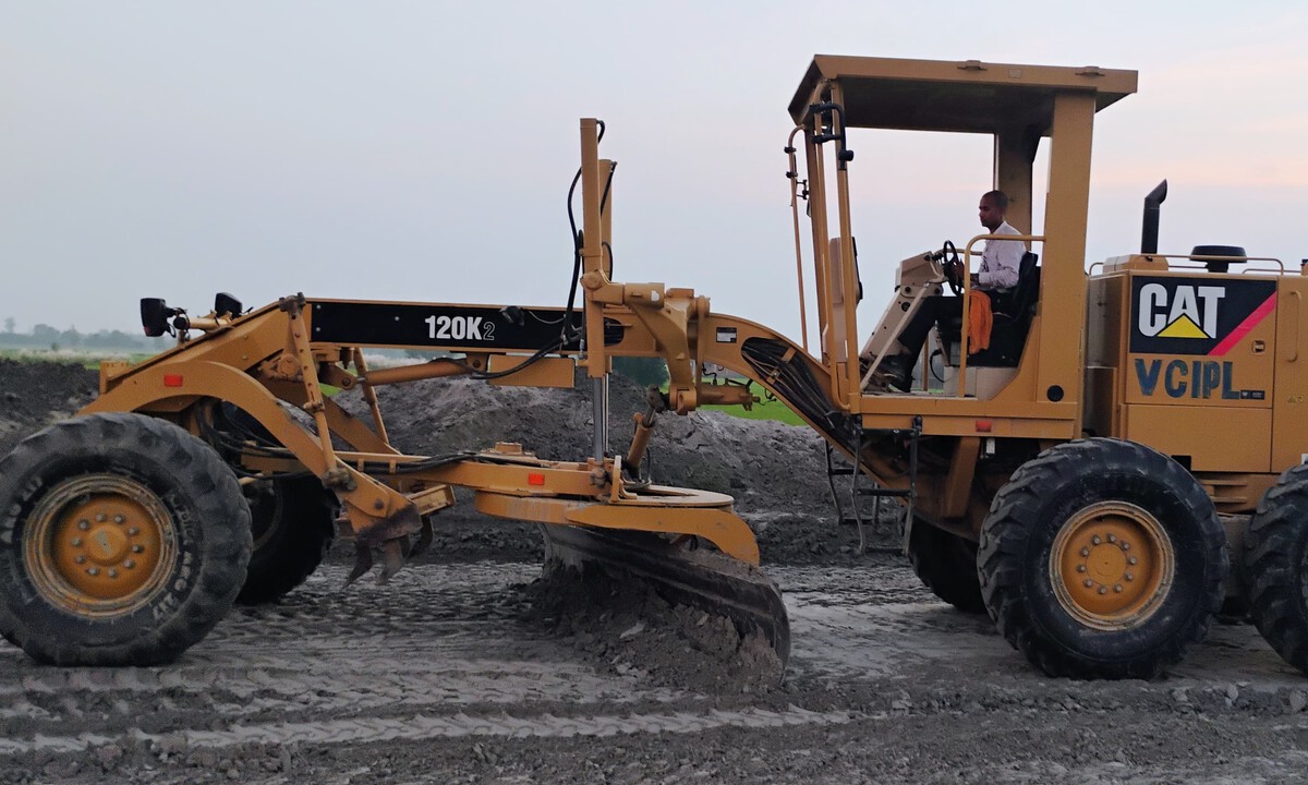 A motor grader is a construction machine designed for fine grading and leveling surfaces. Equipped with a long adjustable blade, it smooths and shapes roads, prepares surfaces for paving, and maintains dirt or gravel paths. Its precision control and versatility make it essential for road construction and site preparation.